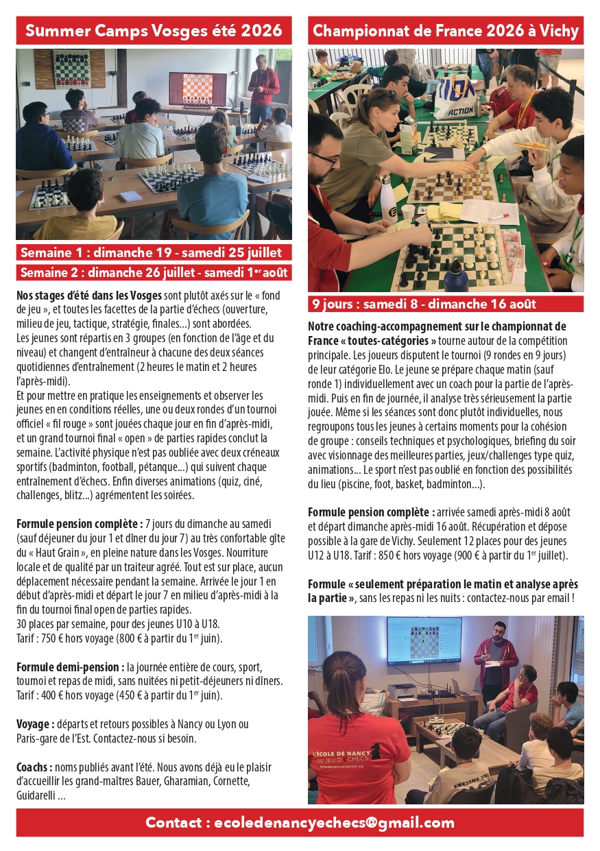 Pour recevoir le dossier d’inscription, ou pour tout renseignement, contactez-nous par email à : ecoledenancyechecs@gmail.com